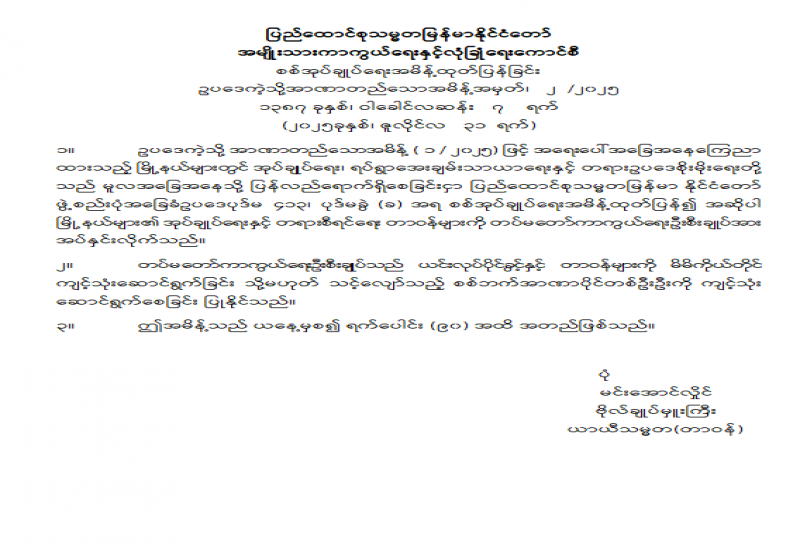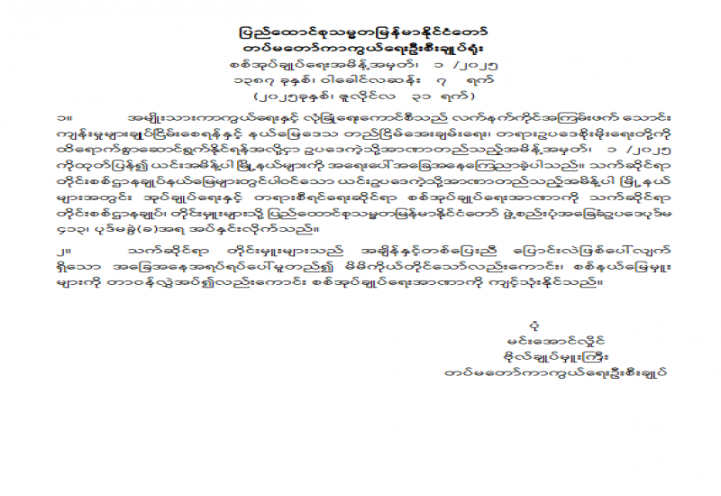အကြမ်းဖက်အုပ်စုအဖြစ်ကြေညာထားသည့် CRPH ၊ NUG နှင့် ယင်းတို့၏ လက်ဝေခံအဖွဲ့အစည်းများ၊ ယင်းတို့နှင့် ဆက်နွှယ်နေသော အဖွဲ့အစည်းများ၊ လူပုဂ္ဂိုလ်များသည် နိုင်ငံတော်တည်ငြိမ်အေးချမ်းရေးကို ပျက်ပြားစေရန်နှင့် အစိုးရယန္တရားများ ပျက်ပြားစေရန် ရည်ရွယ်လျက်လှုံ့ဆော်ခြင်း၊ ဝါဒဖြန့်ခြင်းများပြုလုပ်ခဲ့မှုအပေါ် ဥပဒေနှင့်အညီ ထိရောက်စွာ အရေးယူသွားမည်ဖြစ်ကြောင်းနှင့် ထိုသို့လှုံ့ဆော်သူ၊ ဝါဒဖြန့်သူများအား ဆက်လက်ဖော်ထုတ် အရေးယူသွားမည်ဖြစ် ကြောင်း မိဘပြည်သူများသိရှိနိုင်ရေး အသိပေးသတင်းထုတ်ပြန်ပြီးဖြစသည်။