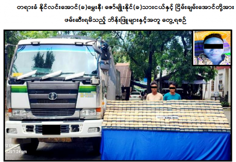 လုံခြုံရေးတပ်ဖွဲ့ဝင်များပါဝင်သော ပူးပေါင်းအဖွဲ့သည် ဇွန်လ ၂၈ ရက်နေ့ ညနေ ၅ နာရီအချိန် သတင်းအရ ကလေးမြို့နယ်၊ အေးသာယာကျေးရွာအနီးတွင် မန္တလေးမှကလေးသို့ နိုင်လင်းအောင် (ခ) မွှေးနီ မောင်းနှင်ပြီး ဇော်မျိုးနိုင် (ခ) သားငယ် လိုက်ပါလာသည့် MDY-14 8I/xxxx I ZONE အမျိုးအစား ၁၂ ဘီး မော်တော်ယာဉ်ပေါ်မှ ဘိန်းဖြူ ၂၆ ဒသမ ၄ ကီလို (၎င်းဒေသကာလ တန်ဖိုးငွေကျပ် ၁ ဒသမ ၃၂ ဘီလီယံ) အား ဖမ်းဆီးရမိပြီး ကွင်းဆက်ဖော်ထုတ်ချက်အရ ဖမ်းဆီးရမိဘိန်းဖြူများအား မန္တလေးတိုင်းမှ ကလေးသို့ သယ်ဆောင်ခိုင်းသူမှာ ပြည်ကြီးတံခွန်မြို့နယ်နေ ငြိမ်းချမ်းအောင်ဖြစ်ကြောင်း သိရှိရသဖြင့် ၎င်းတို့အား ဥပဒေအရအရေးယူထားရှိပြီး ကွင်းဆက်ပြစ်မှုကျူးလွန်သူများအား ဆက်လက်ဖော်ထုတ်လျက်ရှိကြောင်း မြန်မာနိုင်ငံရဲတပ်ဖွဲ့မှ သတင်းရရှိသည်။