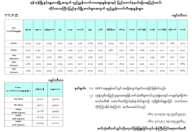 ရန်ကုန်မြို့နှင့် မန္တလေးမြို့အတွက် ရည်ညွှန်းလက်ကားဈေးနှုန်းများနှင့် ပြည်ထောင်စုနယ်မြေ နေပြည်တော်၊ တိုင်းဒေသကြီး/ပြည်နယ် မြို့တော်များအတွက် ရည်ညွှန်းလက်လီဈေးနှုန်းများ