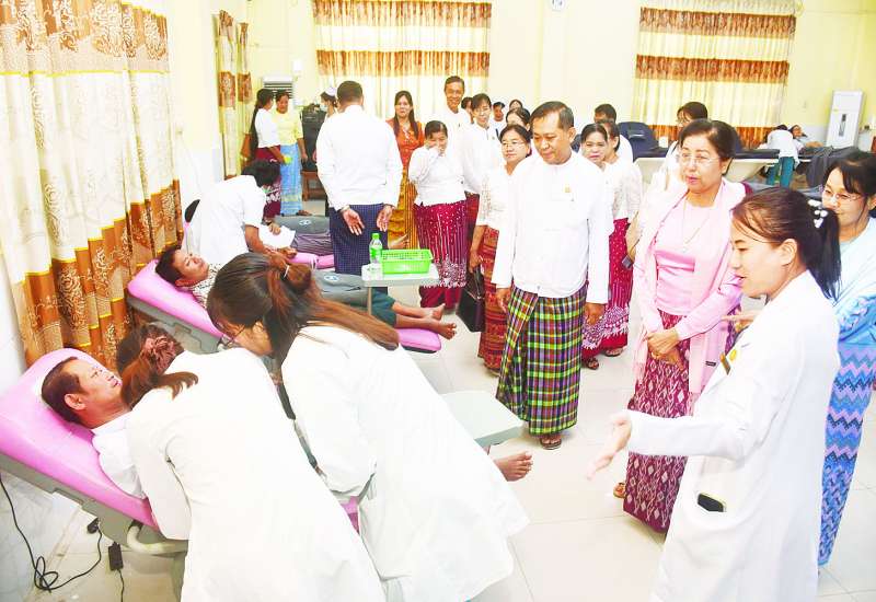 ဇူလိုင် ၃ ရက်တွင်ကျရောက်မည့် မြန်မာအမျိုးသမီးများနေ့ကို ကြိုဆိုဂုဏ်ပြုသောအားဖြင့် ပြည်ထောင်စုစာရင်းစစ်ချုပ်ရုံး ဝန်ထမ်းများ၏ စုပေါင်းသွေးလှူဒါန်းပွဲကို ယမန်နေ့နံနက်ပိုင်းက နေပြည်တော်အထွေထွေရောဂါကုဆေးရုံကြီး (ခုတင်-၁၀၀၀)၌ ကျင်းပရာ ပြည်ထောင်စုစာရင်းစစ်ချုပ် ဒေါက်တာခင်နိုင်ဦး တက်ရောက်ကြည့်ရှုအားပေးသည်။