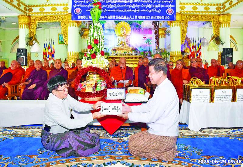 မန္တလေးတိုင်းဒေသကြီး မြို့နယ်ခုနစ်မြို့နယ်ရှိ ငလျင်ဘေးသင့်သံဃာတော်များနှင့် သီလရှင်စုစုပေါင်း အပါး ၁၁၁၀၀ အတွက် မန္တလေးယူနန် ဗုဒ္ဓဘာသာ ဘုရားကျောင်း၊ မြန်မာပြည်ဖွား တရုတ်မျိုးနွယ်စုနှင့် စေတနာရှင်များစုပေါင်း၍ ဆန်၊ ဆီ၊ ကုလားပဲများ လှူဒါန်းပွဲအခမ်းအနားကို ယနေ့နံနက်ပိုင်းတွင် ချမ်းအေးသာစံမြို့နယ် မာန်အောင်ရတနာစေတီတော် ဝါခင်းကုန်းဘုရားရှိ သိန်းသန်းရတနာ သာသနာ့ဗိမာန်တော်ကြီး၌ ကျင်းပသည်။