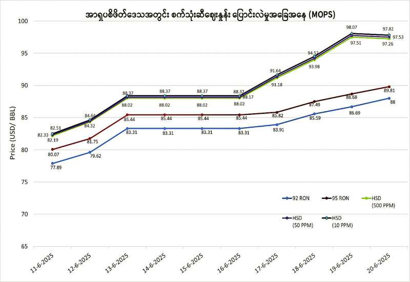 ယခုသီတင်းပတ်ကာလများအတွင်း ကမ္ဘာ့ရေနံဈေးနှုန်းမြင့်တက်မှုနှင့်အတူ အာရှပစိဖိတ်ဒေသအတွင်း စက်သုံးဆီဈေးနှုန်းများသည် တစ်စည်လျှင် ၁၀ ဒေါ်လာမှ ၁၅ ဒေါ်လာခန့်အထိ မြင့်တက်ခဲ့သဖြင့် ပြည်တွင်းစက်သုံးဆီဈေးနှုန်းများလည်း မြင့်တက်ခဲ့ကြောင်း၊