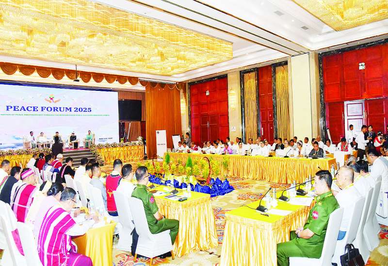 “ငြိမ်းချမ်းရေး၊ ရွေးကောက်ပွဲနှင့် ဖက်ဒရယ်စနစ်တို့ ပေါင်းစည်းခြင်းမှ အေးချမ်းသာယာဝပြောသည့် နိုင်ငံတော်သစ်ဆီသို့သုံးသပ်ဆွေးနွေးပွဲ” ငြိမ်းချမ်းရေးဖိုရမ် - Peace Forum 2025 ကို ယနေ့နံနက်ပိုင်းတွင် နေပြည်တော်ရှိ မင်္ဂလာသီရိဟိုတယ်ခန်းမ၌ ဒုတိယနေ့အဖြစ် ဆက်လက်ကျင်းပသည်။