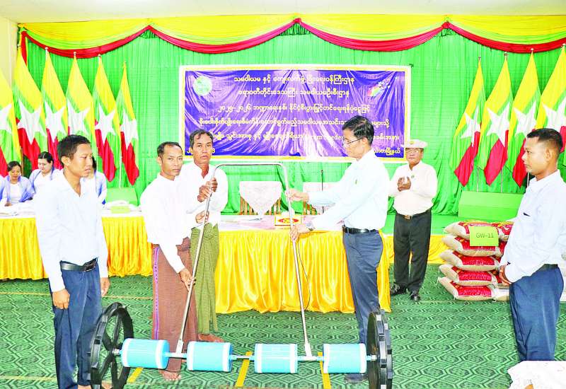 ဧရာဝတီတိုင်းဒေသကြီး ဟင်္သာတမြို့နယ်၊ ဇလွန်မြို့နယ်နှင့် လေးမျက်နှာမြို့နယ်အတွင်းရှိ စိုက်ပျိုးရေးသမဝါယမအသင်း ၁၈ သင်း၊ မြန်အောင်မြို့နယ်၊ ကြံခင်းမြို့နယ်နှင့် အင်္ဂပူမြို့နယ်အတွင်းရှိ စိုက်ပျိုးရေးသမဝါယမအသင်း ၁၁ သင်းတို့အတွက် ငွေကျပ် ၁၅၀၃ သန်းတန်ဖိုးရှိ အထွက်တိုးစပါးမျိုးများ၊ သွင်းအားစုများ၊ မျိုးစေ့ချကိရိယာများ ပေးအပ်ပွဲအခမ်းအနားကို ယမန်နေ့က ဟင်္သာတမြို့အထွေထွေအုပ်ချုပ်ရေးဦးစီးဌာနရုံး၌ ကျင်းပရာ သမဝါယမနှင့်ကျေးလက်ဖွံ့ဖြိုးရေးဝန်ကြီးဌာန ဒုတိယဝန်ကြီး ဦးမြင့်စိုး၊ တိုင်းဒေသကြီး လမ်းပန်းဆက်သွယ်ရေးဝန်ကြီးနှင့် ဌာနဆိုင်ရာတာဝန်ရှိသူများ၊ သမဝါယမအသင်းသား တောင်သူများ တက်ရောက်သည်။