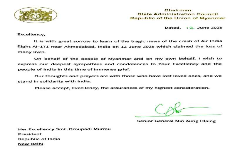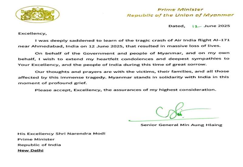 နိုင်ငံတော်စီမံအုပ်ချုပ်ရေးကောင်စီဥက္ကဋ္ဌ နိုင်ငံတော်ဝန်ကြီးချုပ် ဗိုလ်ချုပ်မှူးကြီး မင်းအောင်လှိုင်သည် ယနေ့တွင် အိန္ဒိယသမ္မတနိုင်ငံ အမီဒါဘတ်မြို့အနီး၌ အိန္ဒိယလေကြောင်း AI-171 ပျက်ကျခဲ့မှုကြောင့် လူပေါင်းများစွာ အသက်ဆုံးရှုံးခဲ့ရမှုများအတွက် ဝမ်းနည်းကြောင်းသဝဏ်လွှာကို အိန္ဒိယသမ္မတနိုင်ငံ ဝန်ကြီးချုပ် ရှရီ နာရန်ဒရာ မိုဒီ ထံသို့ ပေးပို့သည်။