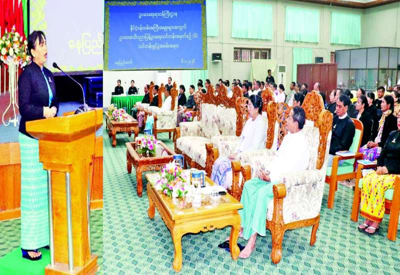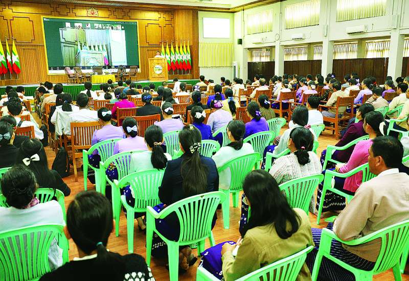 နိုင်ငံ့ဝန်ထမ်းအကြီးအမှူးများအတွက် ဥပဒေအသိပညာပြန့်ပွား ရေးသင်တန်းအမှတ်စဉ်(၆) ဖွင့်ပွဲအခမ်းအနားကို ယနေ့နံနက်ပိုင်းတွင် ဥပဒေရေးရာဝန်ကြီးဌာန မြေညီထပ်အစည်းအဝေးခန်းမ၌ကျင်းပရာ ပြည်ထောင်စုဝန်ကြီးနှင့် ပြည်ထောင်စုရှေ့နေချုပ် ဒေါက်တာသီတာဦး၊ နိုင်ငံတော် သမ္မတရုံးဝန်ကြီးဌာန(၄) ပြည်ထောင်စုဝန်ကြီး၊ ပြည်ထောင်စုစာရင်းစစ်ချုပ်၊ စိုက်ပျိုးရေး၊ မွေးမြူရေးနှင့် ဆည်မြောင်းဝန်ကြီးဌာန ဒုတိယဝန်ကြီး၊ ဥပဒေရေးရာဝန်ကြီးဌာန ဒုတိယဝန်ကြီးနှင့် ဒုတိယရှေ့နေချုပ်၊ ရခိုင်ပြည်နယ်ဥပဒေချုပ်၊ ဥပဒေရေးရာဝန်ကြီးဌာနမှ ဌာနဆိုင်ရာ တာဝန်ရှိသူများနှင့် သင်တန်းသား သင်တန်းသူများ တက်ရောက်ကြသည်။