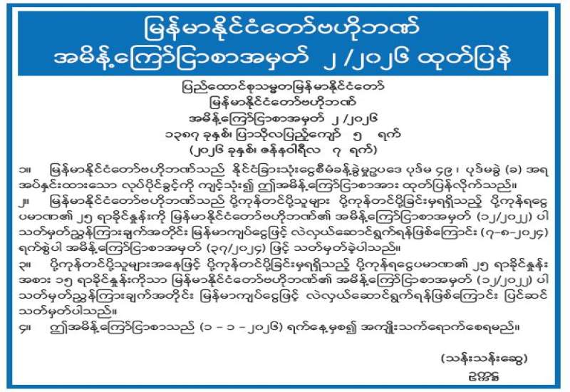 မြန်မာနိုင်ငံတော်ဗဟိုဘဏ် အမိန့်ကြော်ငြာစာအမှတ် ၂ /၂၀၂၆ ထုတ်ပြန်