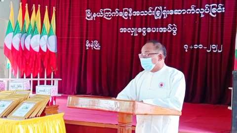 မိုးနဲမြို့နယ် ကြက်ခြေနီအသင်း(ခွဲ)ရုံး ဆောက်လုပ်ရန်အတွက် အလှူငွေကျပ် ၅၇၂၅၀၀၀ ပေးအပ်လှူဒါန်းပွဲကျင်းပ